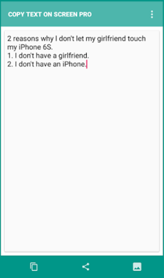 كل ما عليك فعلة هو تقوم بألتقاط صورة للشاشة من خلال النص الذي تريد ان تقوم بنسخة ومن ثم تقوم بفتح الصورة التي تم ألتقاطها وتقوم بمشاركة الصورة علي هذا التطبيق ثم تقوم في هذة الخطوة بتحديد النص وبدقة ليسطيع البرنامج القيام بعملية النسخ ثم تقوم بلانتظار حتي يعالج التطبيق الصورة ويظهر النص الذي تريد ان ينسخ ومن ثم سوف يظهر النص بطريقة مكتوبة وتكوم بنسخة مباشرة .